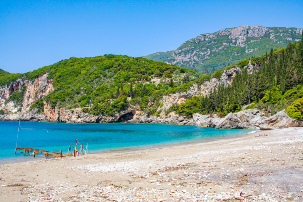 Rovinia Beach is one of Corfu’s most beautiful hidden gems, known for its emerald waters, white pebbles, and peaceful setting. Access is via a short walking path, which helps preserve its calm and unspoiled character.
